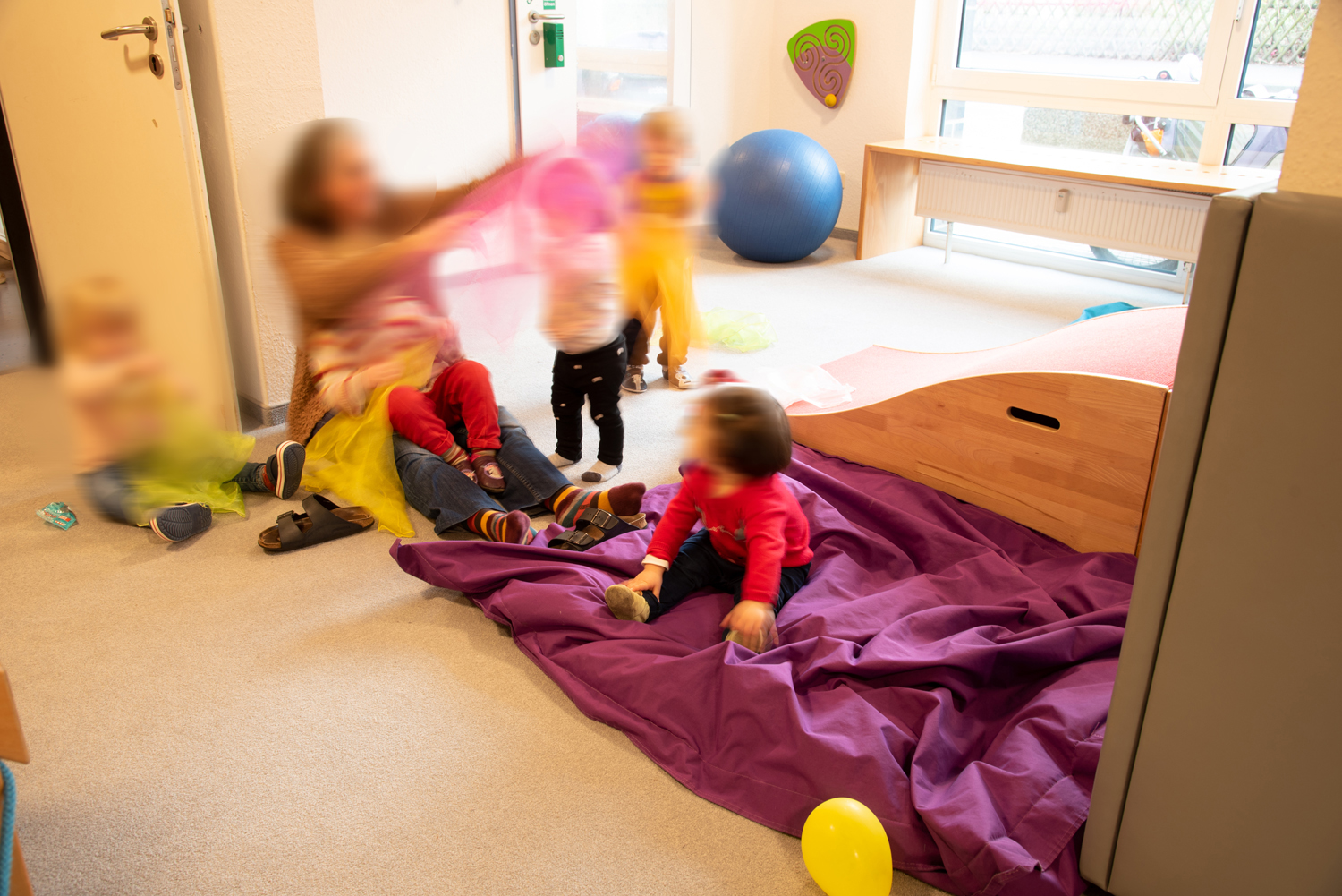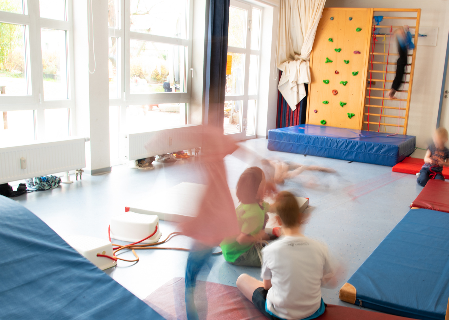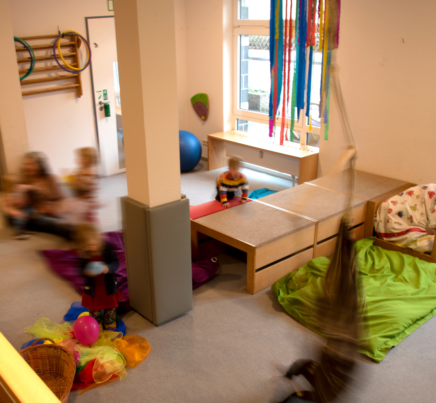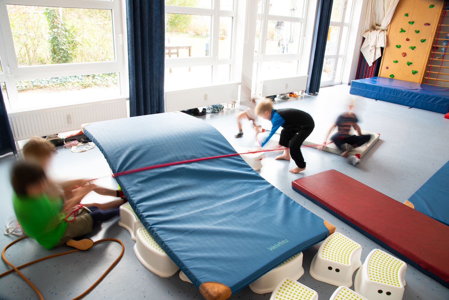 Weiterhin sind im Erdgeschoss zwei Schlafräume, zwei Wickelräume und natürlich das Bistro, in dem die Mahlzeiten eingenommen werden. Außerdem liegt im Erdgeschoss unser großer Turnraum, den wir uns mit den anderen Hausmitbewohnern (Service-Pflege / Betreutes Wohnen) teilen.